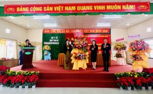 Đồng chí Nguyễn Thị Thu Hương – Phó Chánh văn phòng Thành uỷ Đà Lạt – Đại diện Thành uỷ – Hội đồng nhân dân – Uỷ ban nhân dân – Uỷ ban mặt trận Tổ Quốc Việt Nam Thành phố Đà Lạt trạo tặng hoa chúc mừng